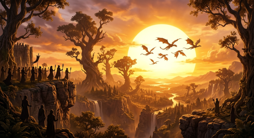 Golden Sunset Fantasy Landscape with Dragons and Elves