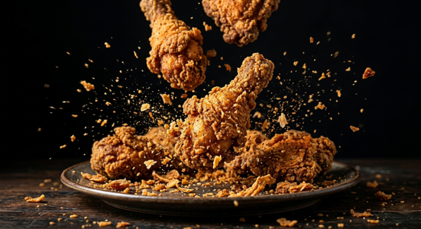 Crispy Fried Chicken Falling on Plate in Slow Motion