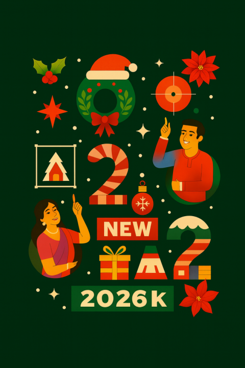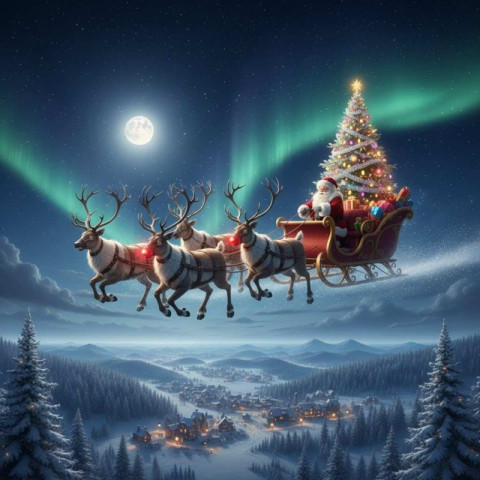 Santa Flies on Sleigh by Reindeer with Christmas Tree Gifts
