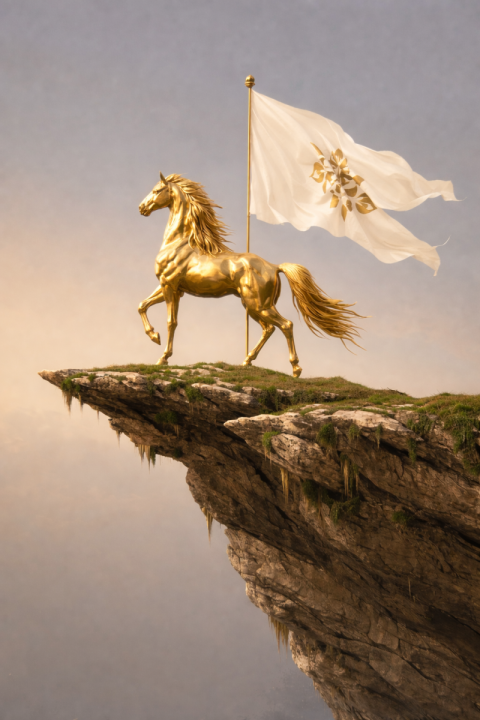 Golden Horse Statue with Flag on Cliff