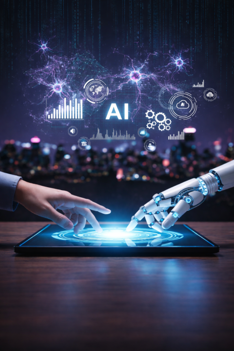 Futuristic AI Technology Concept with Human and Robot Interaction
