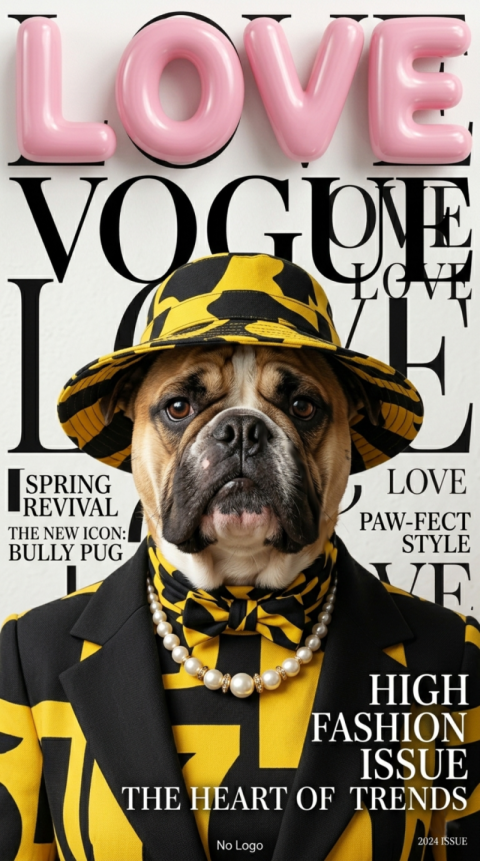 Stylish Bulldog Pug Fashion Model on Vogue Style Magazine Cover