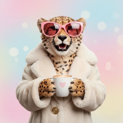 Cheetah Wearing Pink Sunglasses Holding a Coffee Cup