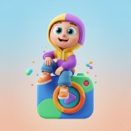 3D Cartoon Character Sitting on Camera Logo Illustration