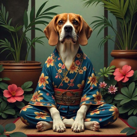 A Beagle Dog Wearing a Floral Kimono AI Image