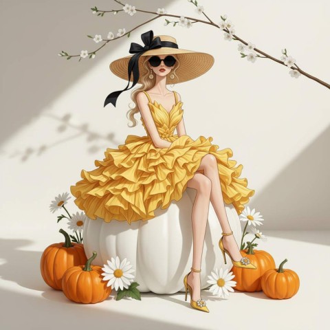 A Beautiful Girl in a Yellow Dress is Sitting on a Pumpkin