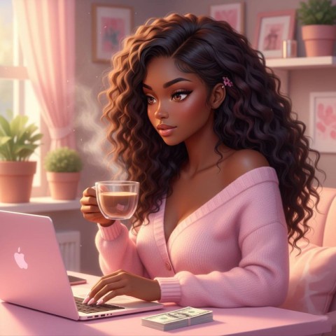 breathtaking anime style realistic young black woman darker skin long wist curly hair wearing soft pink cashmere sweater flawless pink mac laptop laptop screen girly flawless makeup cute business coffee cup modern digital illustration anime style illustration anime woman working on laptop young black woman anime black woman digital art anime freelancer illustration anime office work anime student using laptop modern anime character female anime character working remote work anime illustration creative digital artwork diversity anime illustrationSimilar Photos