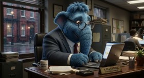 Anthropomorphic Blue Woolly Mammoth in Business Suit Using Laptop