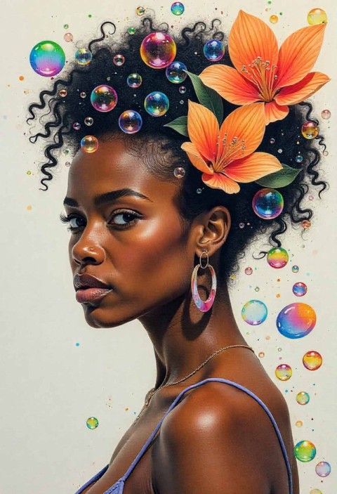 Beautiful African Nymph woman Surrounded Rainbow Bubbles