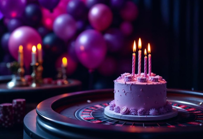 Birthday Celebration Cake with Candles and Colorful Balloons