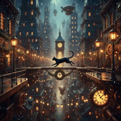 black cat cat walking deep steampunk cityscape steampunk cityscape cyber city buildings geometric glowing gear lamps immersive sense lights traveling golden lights clock reflection christmas city steampunk city background steampunk imagesSimilar Photos