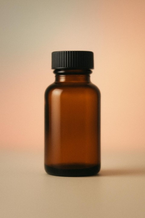AI Prompt: blurry brown amber glass supplement bottle with black cap, blurry modern pastel tones gradient background, 35mm film look, luxury organic brand feel, grain texture.