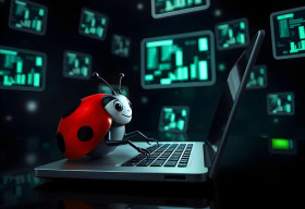 Bug Working on Laptop 3D Cartoon Concept AI Image
