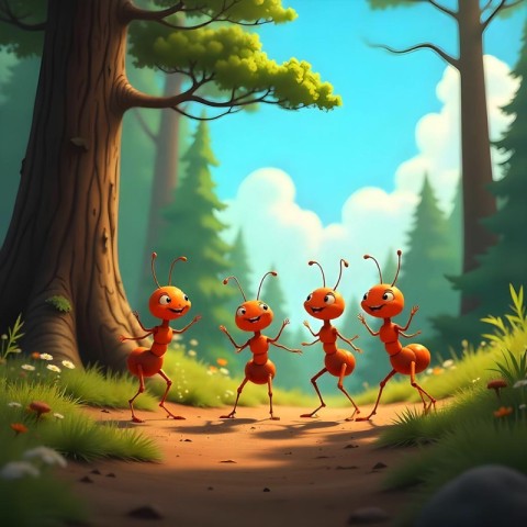 Cartoon Happy Ants Dancing in the Forest AI Image
