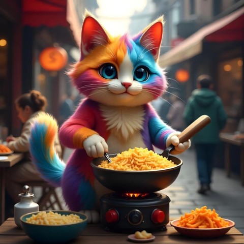 Colorful Cat Holding a Pan Filled with Fried Rice AI Image