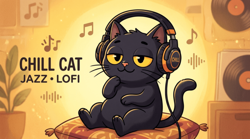 A stylish 2D illustration of a cool black cat with big yellow eyes wearing headphones, immersed in relaxing music. With half-closed eyes and a calm expression, this minimal and clean composition captures a perfect chill vibe. Set against a warm yellow background with soft lighting, the artwork blends jazz pop aesthetics with a soothing mood—ideal for YouTube thumbnails, lo-fi music visuals, and modern digital art inspiration.