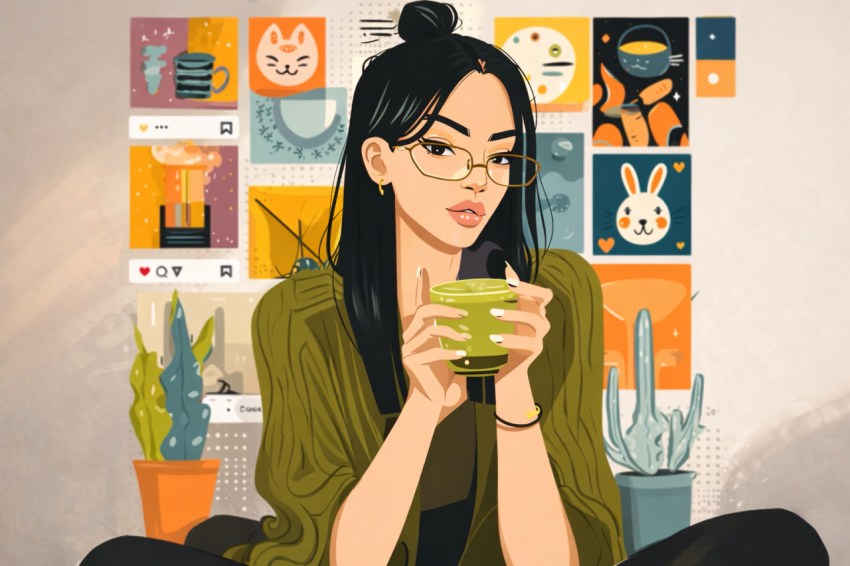 Stylish digital illustration of a cozy aesthetic girl holding a coffee mug in a warm and creative indoor setting. Surrounded by modern artwork, plants, and soft earthy tones, the scene captures a relaxed lifestyle vibe with a minimalist and trendy design. Perfect for social media, lifestyle branding, and aesthetic visual content.