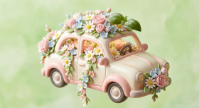 A charming 3D-style illustration featuring a cute retro mini car overflowing with soft pastel flowers like daisies and delicate pink blooms. Set against a gentle green background, the scene evokes a fresh spring vibe with a whimsical and dreamy aesthetic. Designed with soft textures, delicate details, and a soothing color palette, this sweet and playful artwork is perfect for seasonal designs, greeting cards, social media visuals, and creative branding projects.