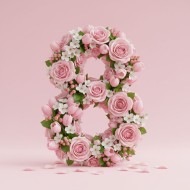 Beautiful number 8 shaped floral wreath featuring soft pink roses, pink tulips, delicate white cherry blossoms, small pink berries, and fresh green leaves. Designed in a feminine and romantic style with scattered petals on a pastel pink background. This high-detail photorealistic 3D render showcases elegant spring flower arrangements with soft studio lighting, perfect for Women’s Day, birthdays, anniversaries, and luxury celebration designs.