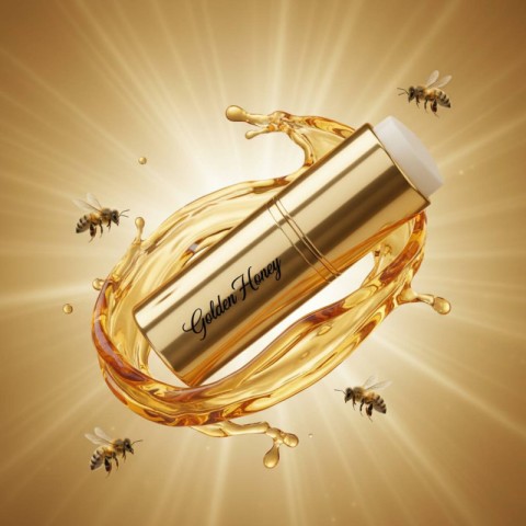 AI Prompt: A luxurious golden cosmetic balm stick labeled “Golden Honey”, floating mid‑air with a dynamic splash of liquid honey wrapping around it. Surrounded by realistic honeybees in motion, glossy golden background, glowing lighting, high-end product photography style. Ultra-detailed, studio shot, soft reflections on the product, elegant and natural aesthetic.