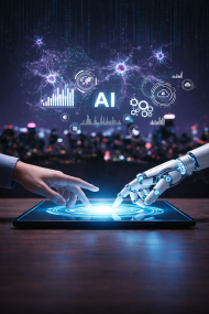 A visually striking futuristic digital artwork showcasing the interaction between a human hand and a robotic hand touching a glowing interface. Surrounded by advanced AI elements such as neural networks, data analytics graphs, and digital icons, this image represents the power of artificial intelligence, machine learning, and technological innovation. The vibrant lighting, high-tech atmosphere, and detailed 4K quality make it perfect for use in technology presentations, AI-related content, and futuristic design projects.