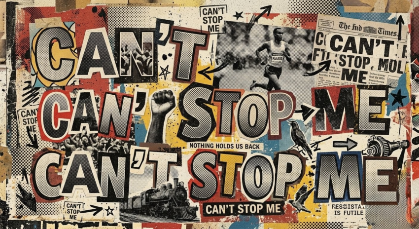 A bold and expressive collage artwork combining layered images and typography that repeatedly spells “Can’t Stop Me.” Designed with a striking halftone effect, the composition features gritty textures, distressed elements, and a raw urban aesthetic. The mix of visuals and repeating text creates a powerful, rebellious tone, making it ideal for street art–inspired posters, modern graphic design projects, and edgy creative concepts.