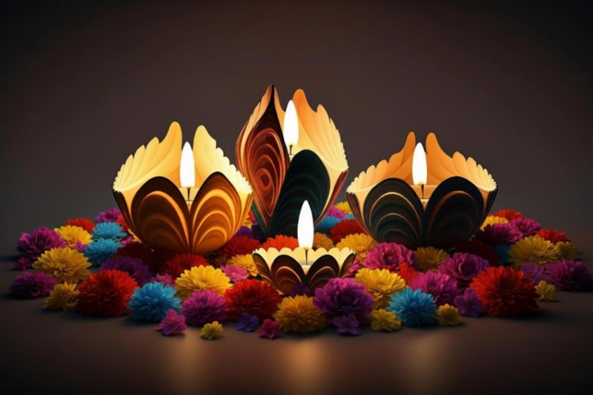 Happy Diwali Diya Decoration with Flowers AI Image