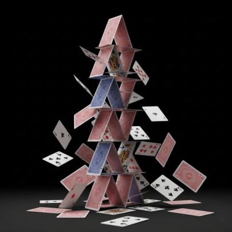 concept of risk collapse house of playing cards falling down house built with playing cards house of playing cards playing cards falling card house collapse fragile structure concept risk and instability failure concept business collapse decree growth no growth faling down risk managementAparnaGoush