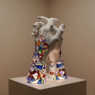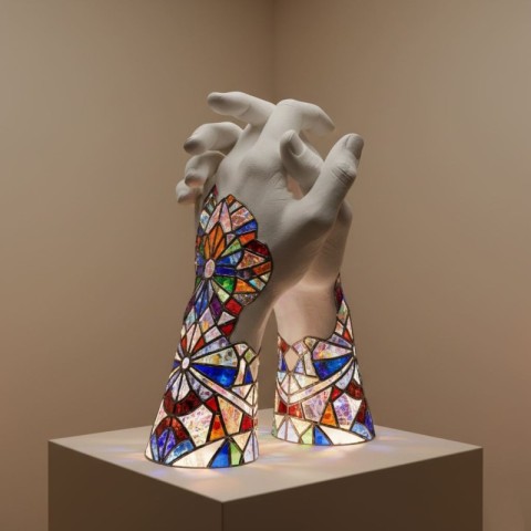 AI Prompt: Human hands: Create a hyper-realistic sculpture that seamlessly blend white plaster with fragments of multicolored stained glass. The sculpture should showcase a harmonious interplay between the matte texture of plaster and the vibrant translucence of stained glass, with intricate, luminous patterns. Design the scene with a neutral background to enhance the focus on the artistic details and interplay of light and color, capturing a refined balance between solidity and fragility.
