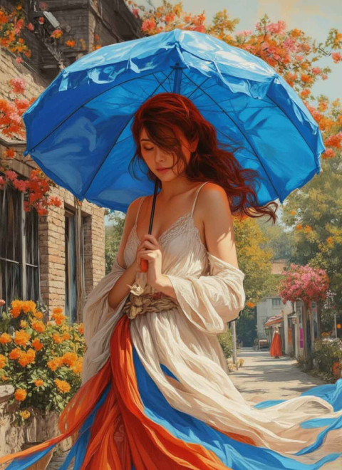 A Beautiful Girl Standing Holding a Blue Umbrella