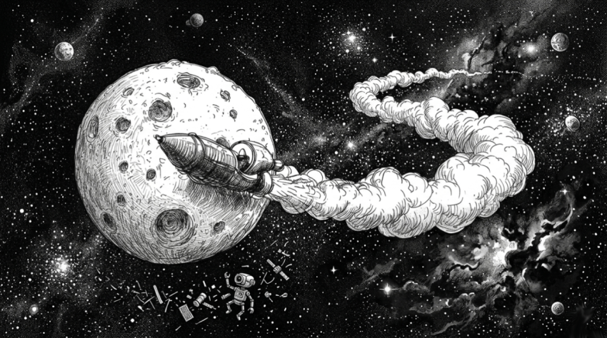 A vintage-inspired sci-fi scene depicting the projectile from From the Earth to the Moon orbiting a stylized, slightly crude moon. The artwork captures the whimsical and theatrical aesthetic of early cinema, inspired by Georges Méliès and classic illustrations by Édouard Riou and Alphonse de Neuville. With a nostalgic 19th-century engraving style, this composition blends literature, early film influence, and retro-futuristic imagination into a timeless visual narrative.