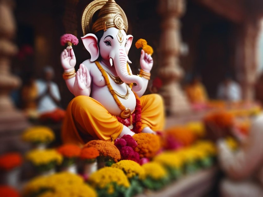 Lord Ganesha People Praying with Flowers and colors in temple AI Image