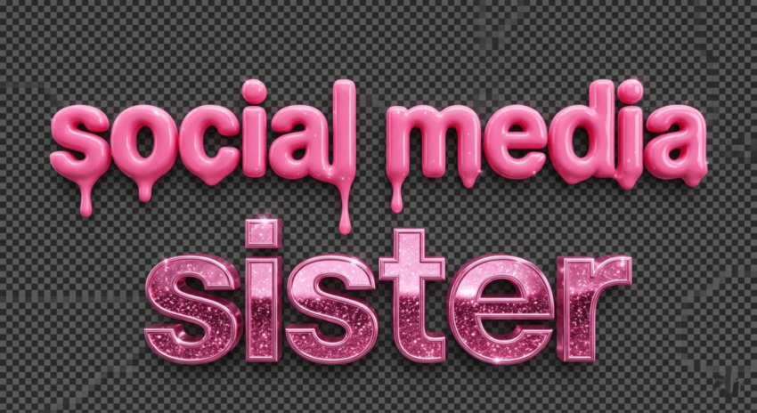A high-end 3D logo design featuring the text “social media” in a creamy, glossy hot pink melted milk texture with realistic drips, smooth rounded edges, and subtle shine. Below, the word “sister” appears in bold pink chrome lettering with a polished, mirror-like metallic finish enhanced by fine glitter sparkles. The composition is centered and modern, enriched with small sparkles and glossy highlights to create a luxurious aesthetic. Designed on a transparent background (PNG), this ultra-detailed 8K render showcases studio lighting, sharp reflections, and cinematic depth—perfect for premium branding, social media identities, and high-impact visual design.
