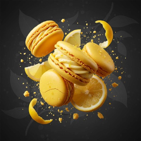 macarons floating mid air lemon slices yellow lemons exploding macaron crumbles monochrome macarons and lemon showcases food images food ad food background commercial ad food banner images crisp creamy crumbles texture dessert premium dessert images food style yellow macaronsSimilar Photos