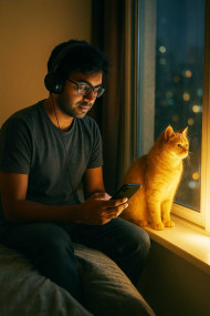 Man Listening Songs Sitting on Bed Cat Beside Window AI Image