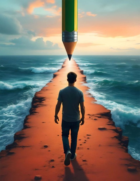 man walking path over ocean ai image digital artwork giant male man walking waves sunset lighting dramatic realistic sky composition creating creative images free wallpapers ai images ai generated images person walking path pictures moving concept forward portrait traveling alone adventure background explore nature walk destination journey education learning trainingSimilar Photos