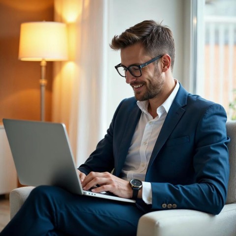 Man With Glasses Using a Laptop with Smiley Face AI Image