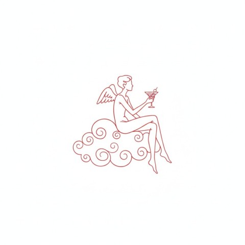 Minimal Red Line Art Cupid Illustration Sitting on Cloud Holding Glass