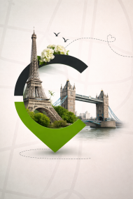 A visually stunning travel-themed banner featuring iconic European landmarks, including the Eiffel Tower in Paris and Tower Bridge in London. Designed with a modern green gradient aesthetic, this high-quality HD image blends architecture, nature, and creativity into a stylish collage. Perfect for travel promotions, tourism marketing, social media posts, and destination-based designs, this artwork captures the essence of European beauty and exploration.