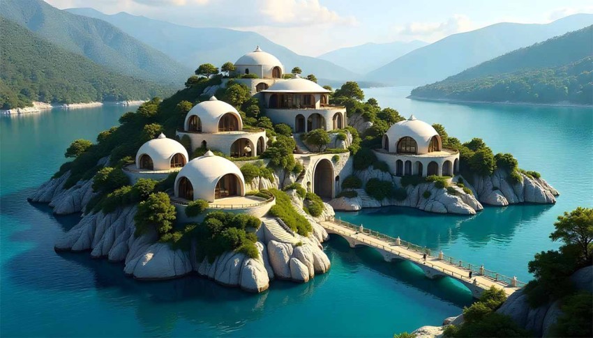 Pearl Houses Rocky Islands Mountains Big Lake AI Image