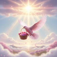 Pink Dove Carrying a Basket of Pink and Purple Valentine Hearts in the Sky