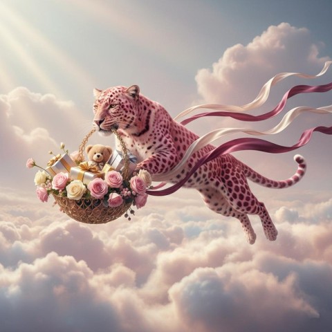 delivering lavish gift drop gift drop mid air clouds running leopard pink leopard god rays pink ribbon trails silk ribbon teddy basket gift drop basket packed with flowers luxury 3d clouds sky gift box surreal fantasy artwork pink leopard jumping 3d dreamy clouds surreal animal art luxury gift drop concept fantasy leopard illustration pastel sky background imaginative wildlife design creative advertising visual vibrant surreal artwork luxury branding conceptSimilar Photos