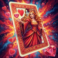 AI Prompt: The card of the queen of hearts of playing cards.the card itself is 2d, the queen is coming out of the card and is 3d. The queen leans out of the card as if grabbing something. Extreme 3d perspective, Very colorfull artwork. Vivid colors.