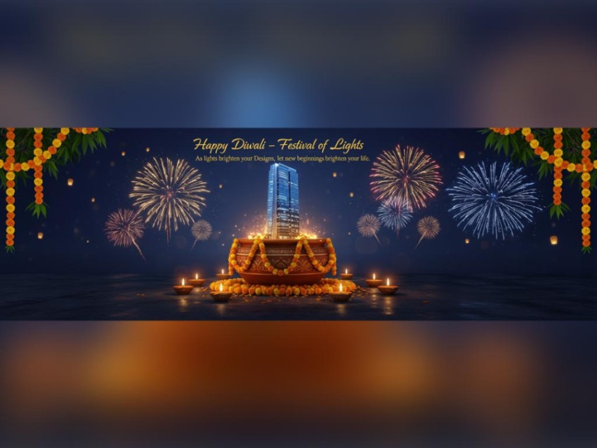 AI Prompt: "Create a conceptual Diwali vertical poster for a real estate brand. Scene: A modern apartment or skyscraper emerging from a large decorative diya bowl, surrounded by fireworks, lanterns, and marigold garlands. Add decorative torans (hanging flower garlands), glowing diyas on the ground, and festive sky with fireworks. Typography: "Happy Diwali – Festival of Lights" in elegant golden script. Subtext: "As lights brighten your home, let new beginnings brighten your life." Include brand logo and website at the bottom. Style: Ultra-realistic, festive, elegant with deep blue and gold tones. Lighting: Bright fireworks illumination and golden glow accents. Add the brand logo (use attached logo) at the bottom center with website."