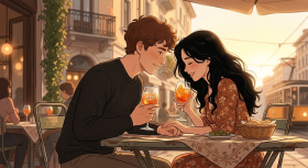 A beautifully animated romantic scene set in a charming café in Milan, featuring a couple sharing Aperol Spritz under warm sunset light. The man, slightly taller with short curly hair, leans gently toward the woman, while she smiles softly with her long black hair flowing. Captured in a cinematic frame with a dreamy, soft animation style, this tender interaction reflects the essence of love, romance, and Italian café culture. Perfect for storytelling, visual inspiration, and aesthetic animation lovers.