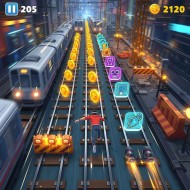 A fast-paced endless runner gameplay scene featuring a character sprinting along a subway track, dodging obstacles and racing through an urban environment. Perfect for mobile gaming promotions, arcade game visuals, action-packed app marketing, and dynamic gameplay showcases.