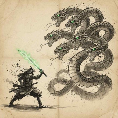 Samurai Facing Serpent Monster Traditional Japanese Ink Wash Painting Illustration