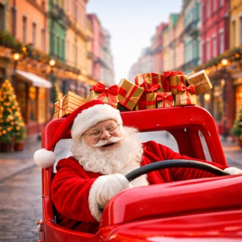 Santa Claus Happily Carrying Gift Boxes in a Car