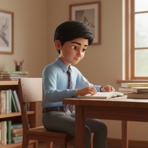 AI Prompt: Computer generated 3D graphic, of an [Indian school boy wearing a formal shirt and pant, loose tie], sitting on a chair, &studying in home , background colours are [beige with wooden accents]