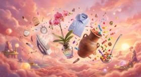 A surreal dreamscape featuring an imaginative collection of mismatching objects floating together in midair, including a blooming orchid in a vase, a dress shirt with an iron, a large clay pottery jar, colorful candies, and a ladle. The scene is filled with warm, diverse colors and a dominant pink tone, creating a whimsical and illogical composition that captures the essence of surreal art and dreamlike creativity.